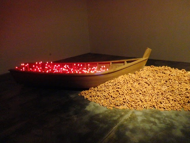 Karya yang menurut saya fenomenal lainnya adalah "Masa lalu dari Masa Lalu". Di tengah ruangan terdapat sebuah perahu kayu yang berisi dengan lampu-lampu dan terdampar pada huruf-huruf yang bertumpuk seperti pasir. Di depannya ada sebuah kursi kayu. Saya berpikir lampu-lampu merah itu sebagai metarfora darah. Sementara teman saya, Andika, berpikir lampu itu merupakan metafora dari para roh yang belum berpulang dan masih menuju suatu tempat--roh kebingungan korban pembantaian.